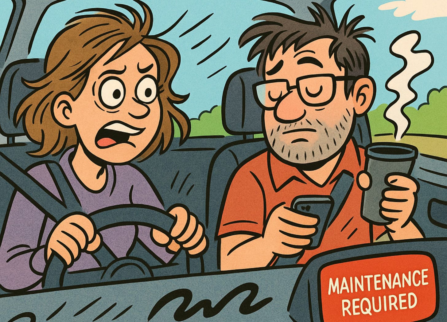Rejoining the morning rush back on the road, I notice a slight play in the brakes. He says all is fine and puts some hip-hop on the radio. He asks if the music is distracting, but it’s not nearly as distracting as the flashing "maintenance required" light on the dashboard, which is now going off every 30 seconds.