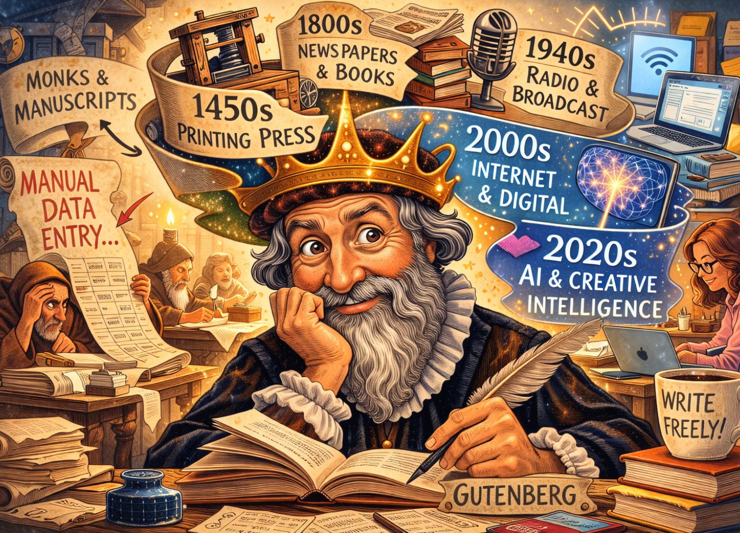 Before Gutenberg, writing was slow, sacred, and controlled. Books were copied by hand by scribes in monasteries by candlelight. Far from romantic, it was painstaking, tedious work. The Church and universities functioned as gatekeepers of knowledge. Gutenberg’s printing press shattered that order.